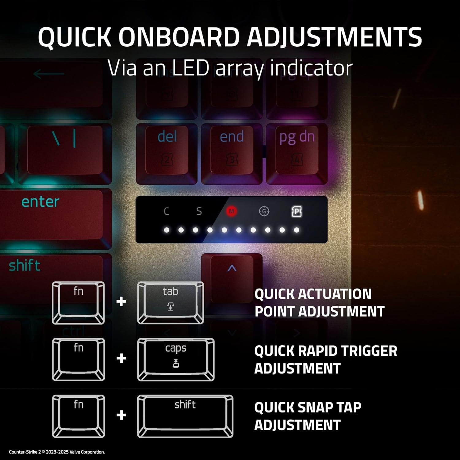 QUICK ONBOARD ADJUSTMENTS — Make precise, on-the-fly adjustments to actuation height or Rapid Trigger sensitivity with the visual aid of an onboard LED array while saving the settings to the keyboard with no software required