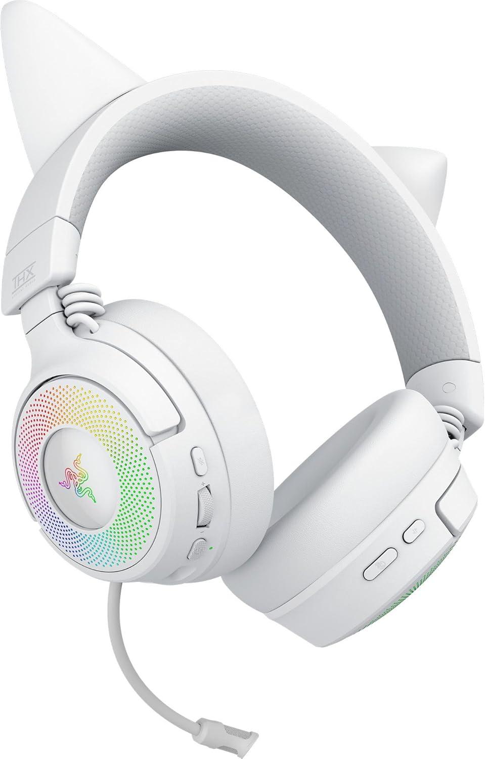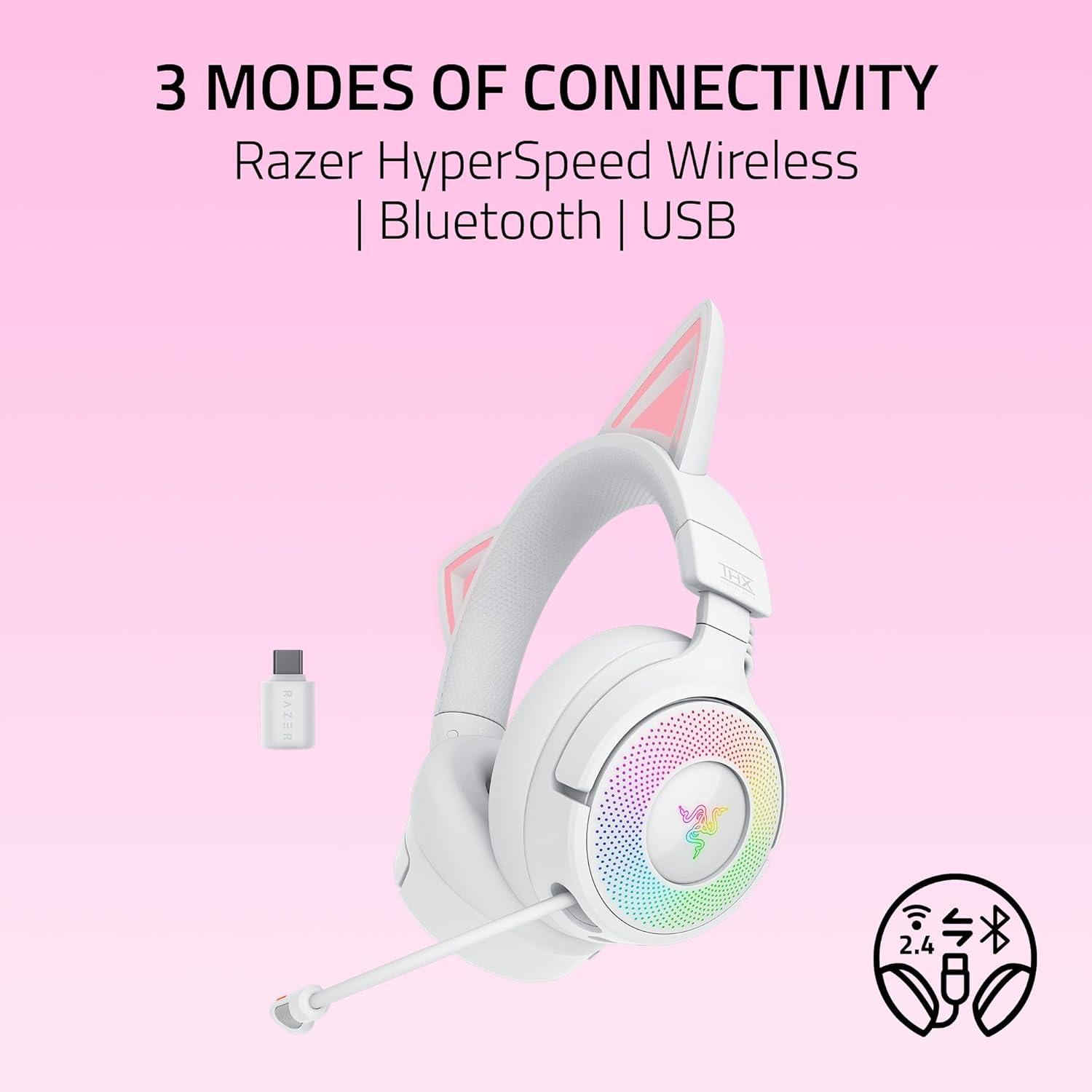 Make a statement with the Razer Kraken Kitty V3 Pro—a wireless gaming headset featuring the most iconic RGB kitty ears in gaming, illuminated by Razer Chroma RGB. With 16.8 million colors and endless effects, customize kitty ears and 9-Zone Earcup Lighting and sync with 300+ games and 500+ devices across 50+ partners for stunning RGB visuals. Enjoy versatile connectivity with Razer HyperSpeed Wireless, Bluetooth, or USB wired mode, compatible with PC, Mac, PlayStation, Nintendo Switch, Steam Deck and smartphones. The Retractable Razer HyperClear Super Wideband Microphone delivers crystal-clear voice quality for team communication and sits flush when retracted. Powered by Razer TriForce Titanium 40mm Drivers, experience high-fidelity sound with deep bass, rich mids, and crisp highs. THX Spatial Audio enhances 7.1 surround sound with custom-tuned THX Game Profiles for realistic positional audio in over 60 titles. Stay immersed and in sync with Game/Chat Balance controls, while Protein Leatherette with Memory Foam Ear Cushions provide long-lasting comfort and sound isolation for intense gaming sessions. Be cute, comfortable, and competitive in style with the Razer Kraken Kitty V3 Pro.